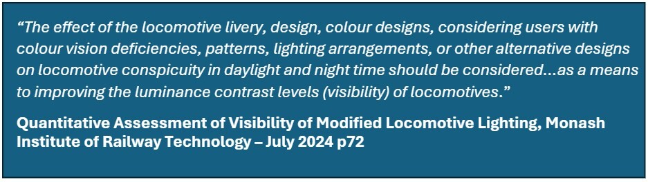 Critically though, it is backed by a significant body of independent research, namely two studies by the Monash Institute of Railway Technology (Monash IRT) - Assessment of Trials To Improve Train Conspicuousness Approaching Passive Level Crossings (2023) and Quantitative Assessment of Visibility of Modified Locomotive Lighting (2024) - both of which were borne out of the Australasian Centre for Railway Innovation (ACRI - now part of the National Transport Research Organisation - NRTO) Freight Train Visibility Review Report (2022).