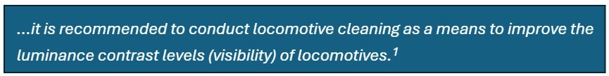 One area covered includes potential controls relating to the nature and cleanliness of locomotive livery. The Monash IRT research found that the nature and cleanliness of locomotive livery’s effects the conspicuity in daylight viewing conditions while locomotive head lights have a greater effect at night. This finding is significant as the ACRI report found that majority of level crossing collisions occur during the day.
